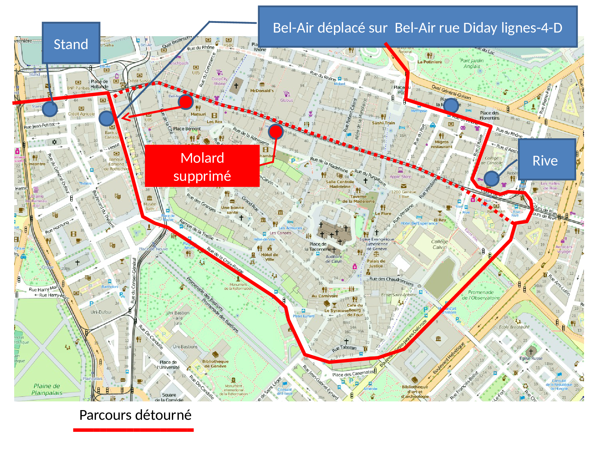 Arrêt Molard : supprimé > se rendre à Rive à l’arrêt de la ligne 7 (devant le Mac Donald)
