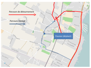 entre les arrêts Coppet-Bourg et Céligny-Gare. L’arrêt Founex est déplacé au croisement Grande ’rue / Route de Céligny, pour une durée de trois mois.