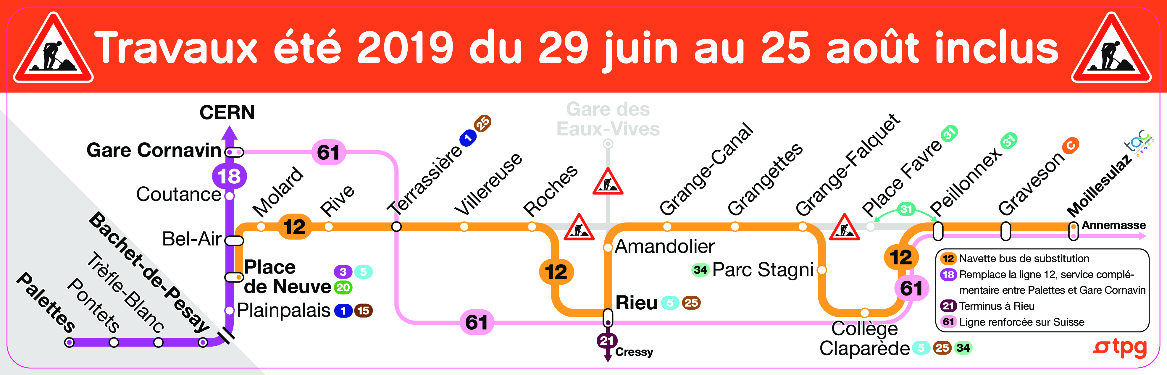 L’axe Chêne de la ligne 12 sera en travaux du 29 juin au 25 août inclus. Le trafic (tram + route) est complètement interrompu au niveau de la nouvelle gare des Eaux-Vives et du goulet de Chêne-Bougeries.