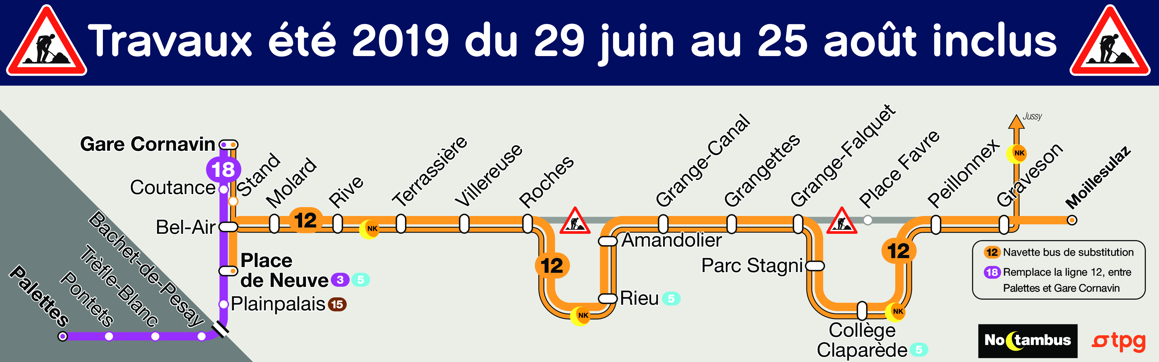 La ligne 12 est remplacée par des bus entre Place de Neuve et Moillesulaz avec des déviations à proximité des zones de chantier.