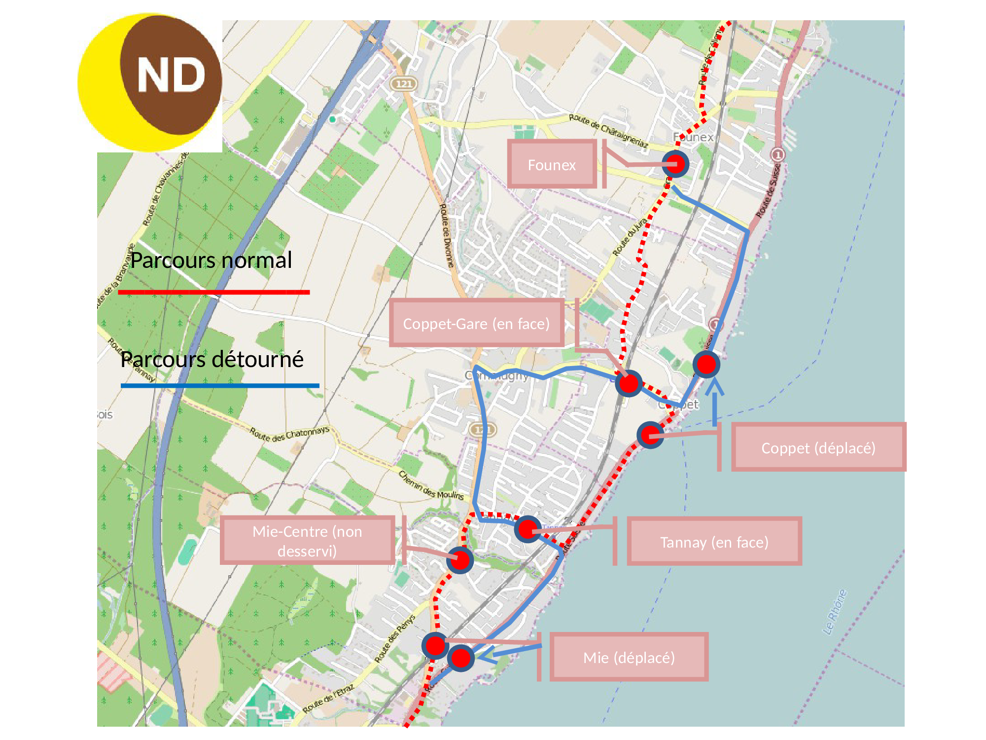 Ligne ND détournée 29 mai 2015 Dès le 29.05.2015 pour une durée de 3 mois la ligne ND sera détournée… Pour plus d’infos, cliquez ici LIGNE CAUSE DESCRIPTION PLAN ND Travaux L’arrêt Mies est déplacé sur la route de Suisse ; l’arrêt Mies-centre n’est pas desservi, l’arrêt Tannay est déplacé, les arrêts Coppet-Gare et Coppet sont déplacés.