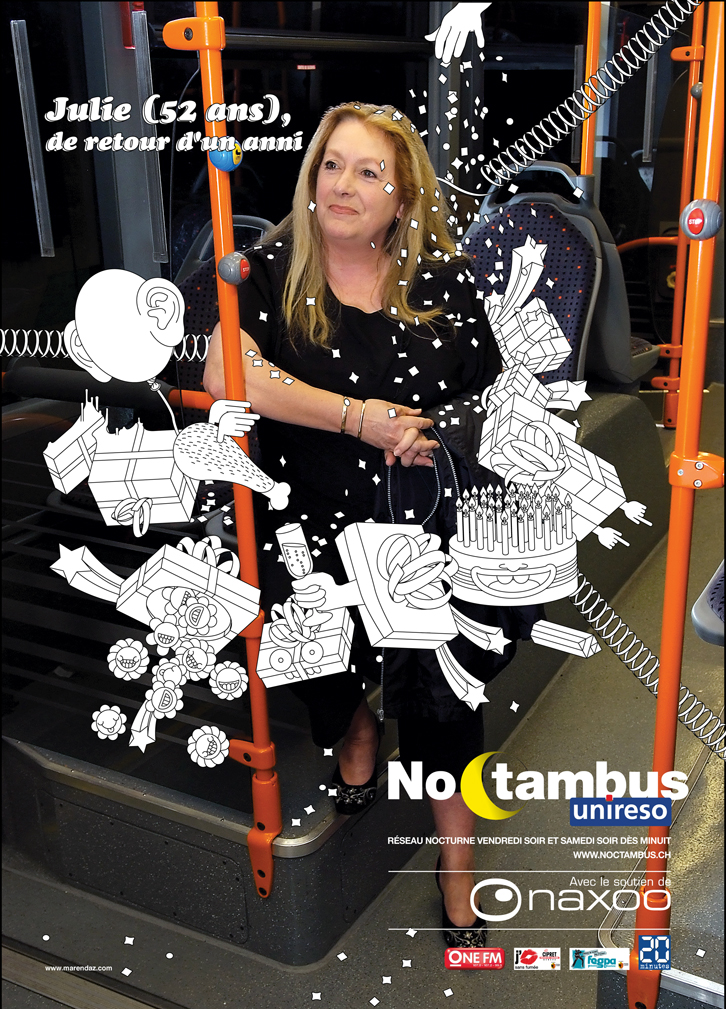 La stratégie de communication 2009 a été construite sur la personnalisation des usagers Noctambus. Les affiches racontent l’expérience et l’utilisation du réseau nocturne dans la vie quotidienne du personnage.